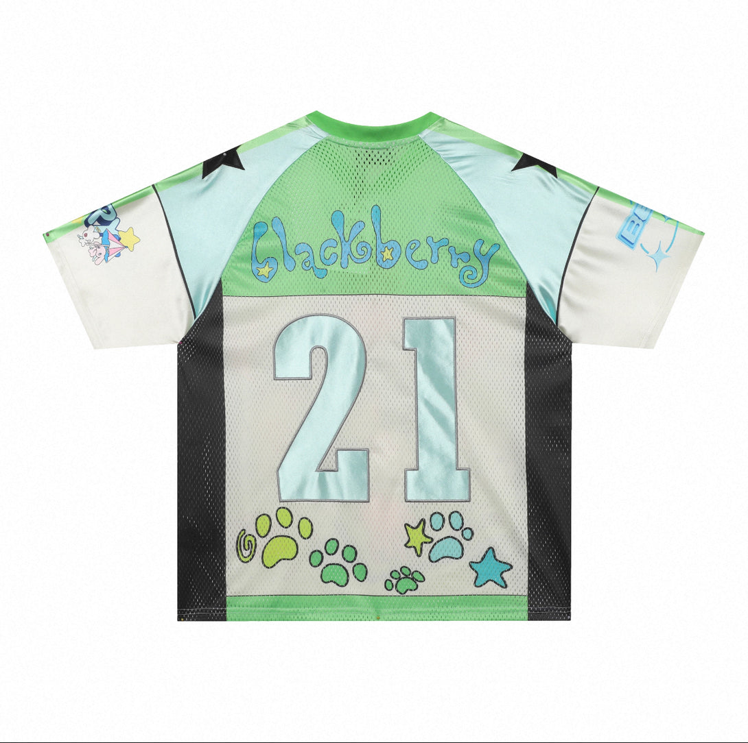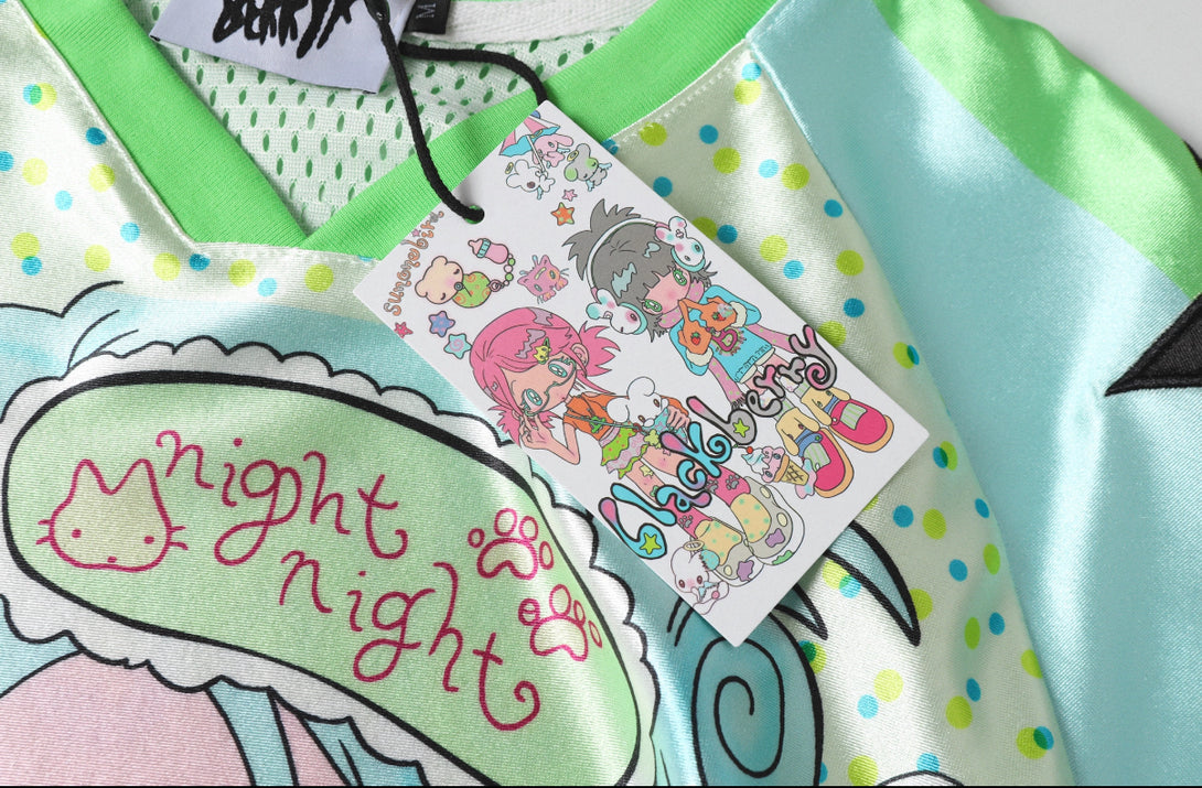 This is a short-sleeved jersey with a playful cartoon design. It has green, white, and black color blocking, featuring a red-eyed girl illustration (wearing a “night night” headband) surrounded by bunnies, a notebook, and stationery. The number “21” and “BlackBerry” text appear near the neckline, with bold blue graphics on the sleeves, blending retro anime and streetwear styles.